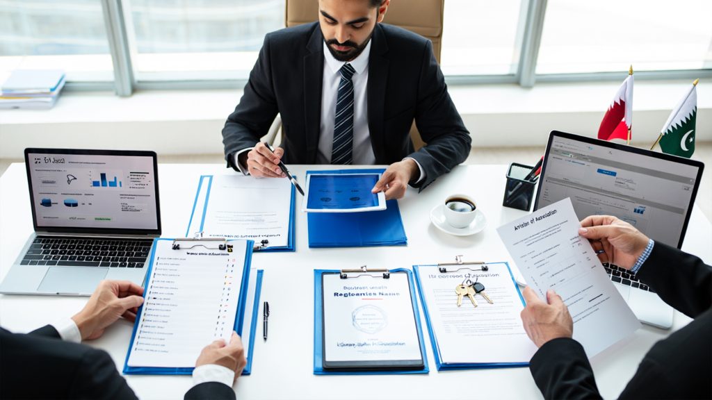 You require a valid passport (6+ months validity), a copy of CNIC, educational and professional certificates certified by the Foreign Ministry of Pakistan and the Qatar Embassy, a bank reference letter, a business plan, and proposed articles. In order to register a branch, other corporate documents such as board resolutions and a power of attorney are needed.